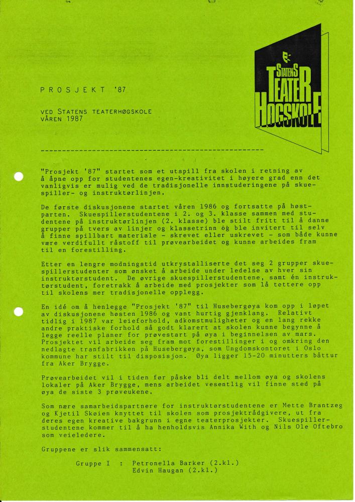 Prosektbeskrivelse til Statens teaterhøgskoles Prosjekt - 87, side 1 (1987)