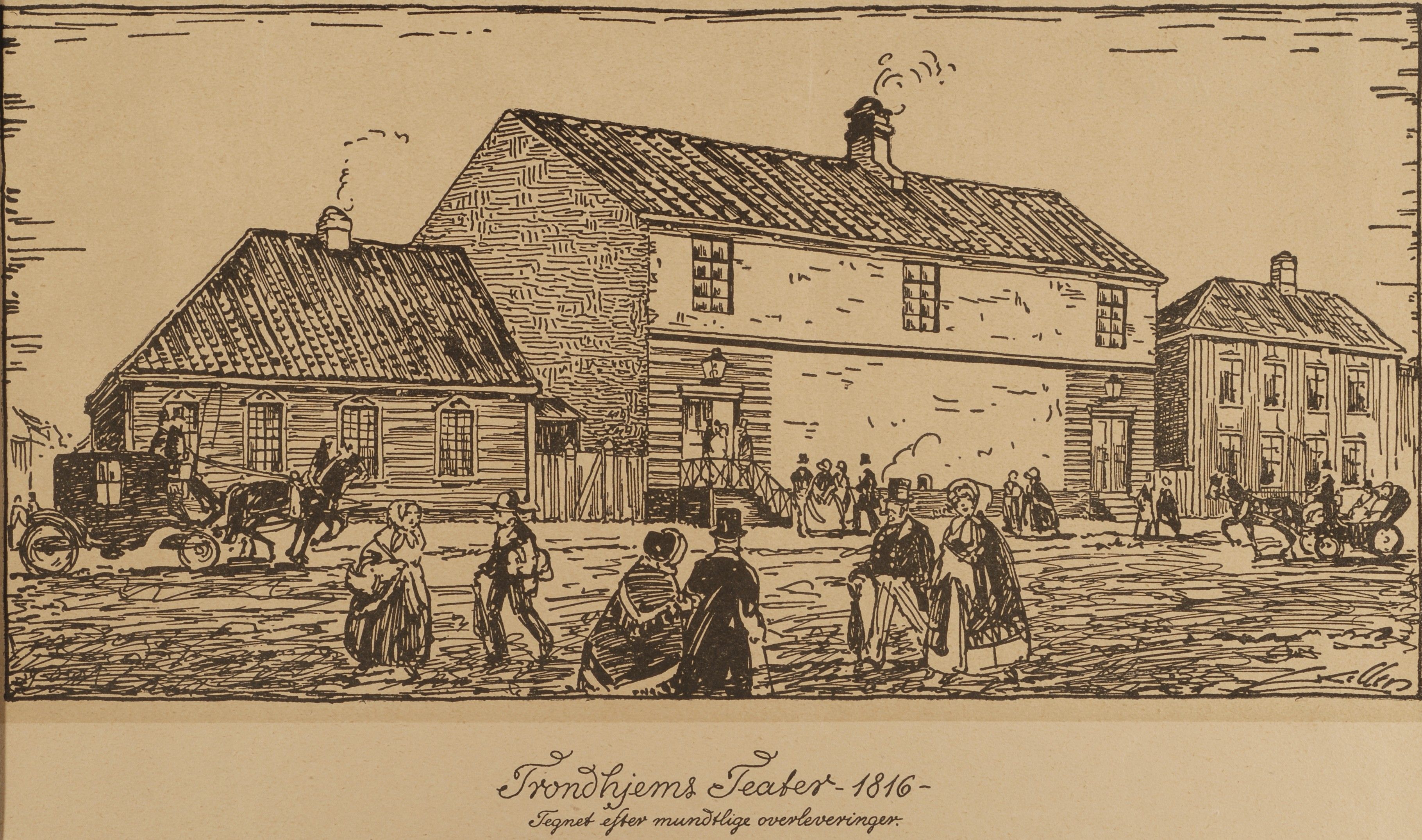 Tegning av bygningen Comediehuset hvor Gamle Scene var, slik den så ut i 1816.