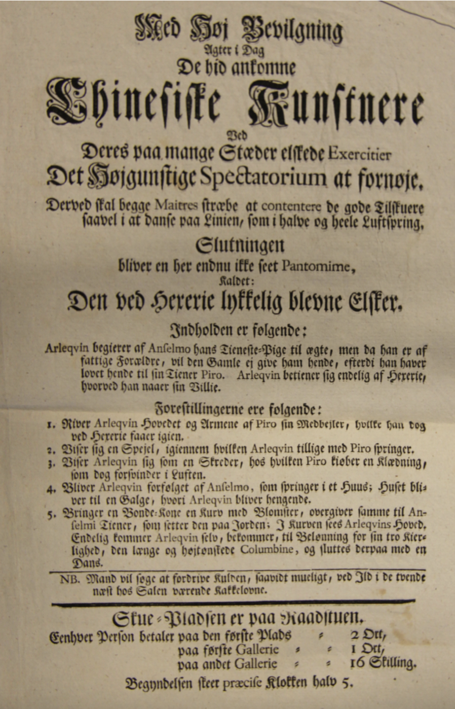 Plakat fra produksjonen De hid ankomne Chinesiske Kunstnere (1751).