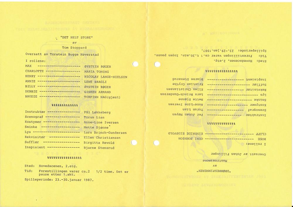 Program til Statens teaterhøgskoles studentproduksjon Det helt store (1987)