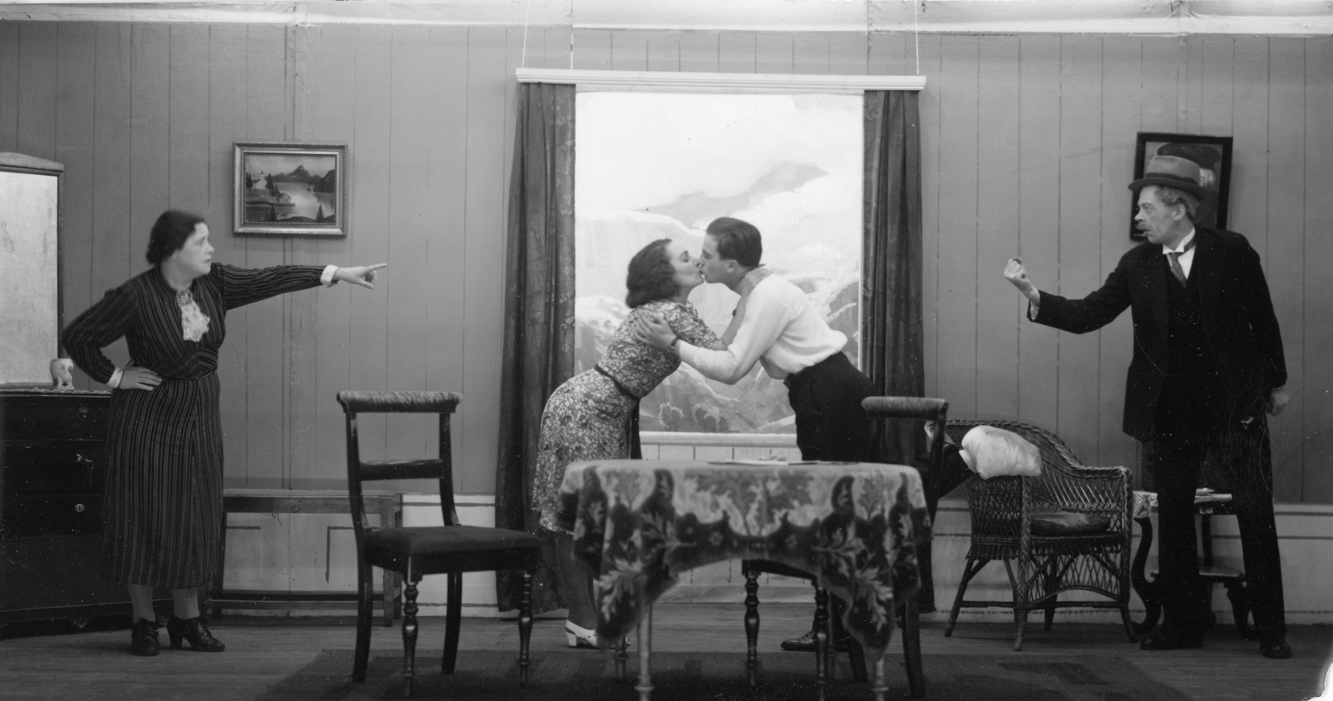 Fotografi fra Komediateatrets produksjon Politikk, fotball og kjærlighet, 1940.