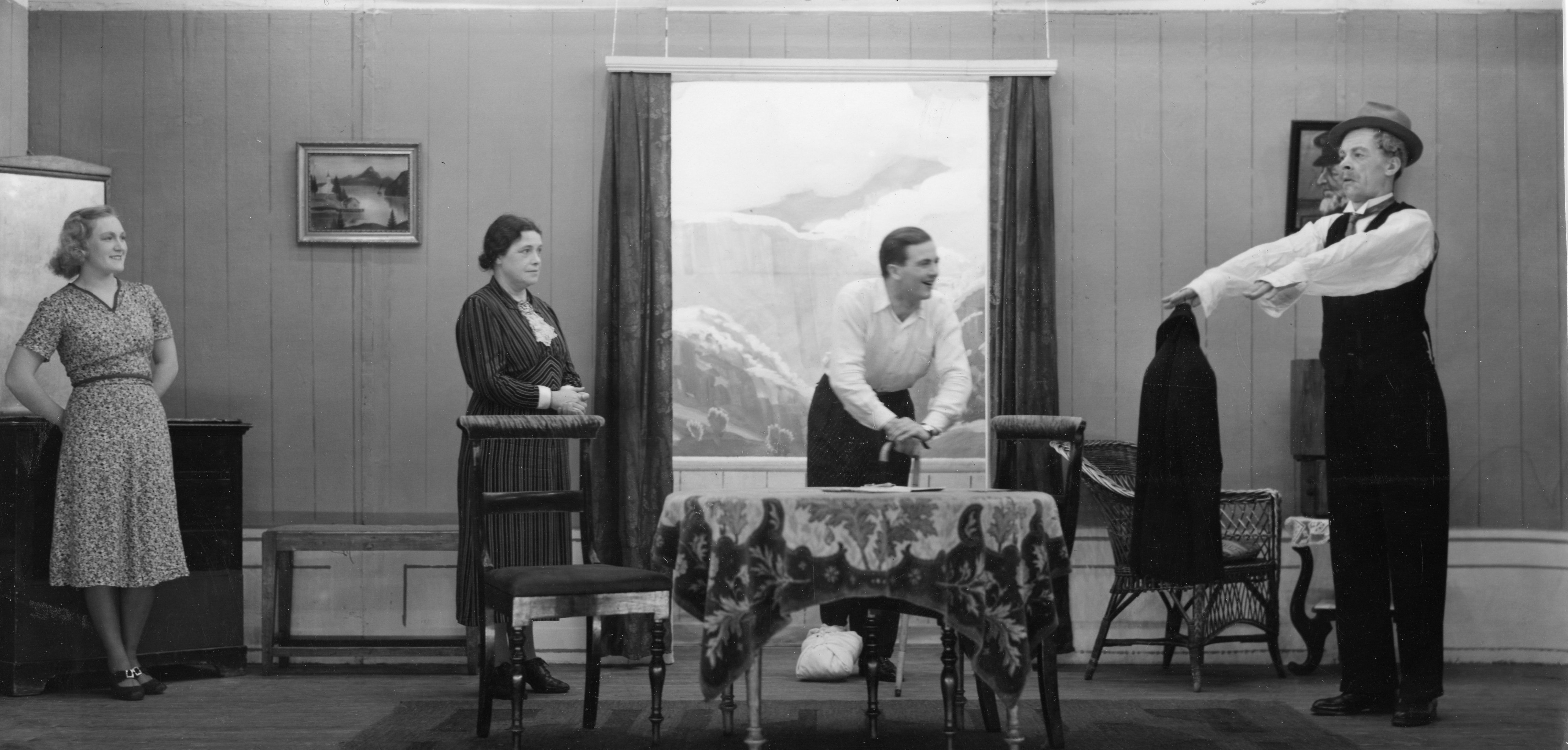 Fotografi fra Komediateatrets produksjon Politikk, fotball og kjærlighet, 1940.