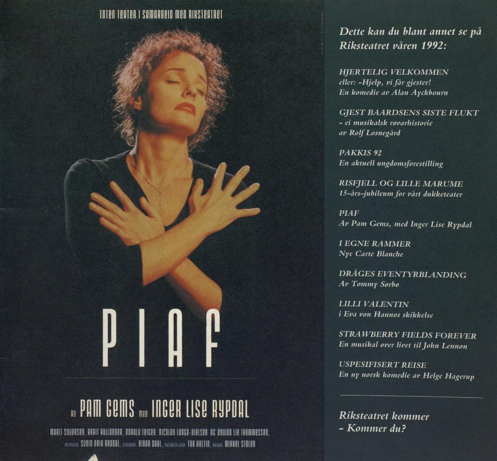 Forestillingsprogram til Riksteatrets produksjon Piaf (1992)