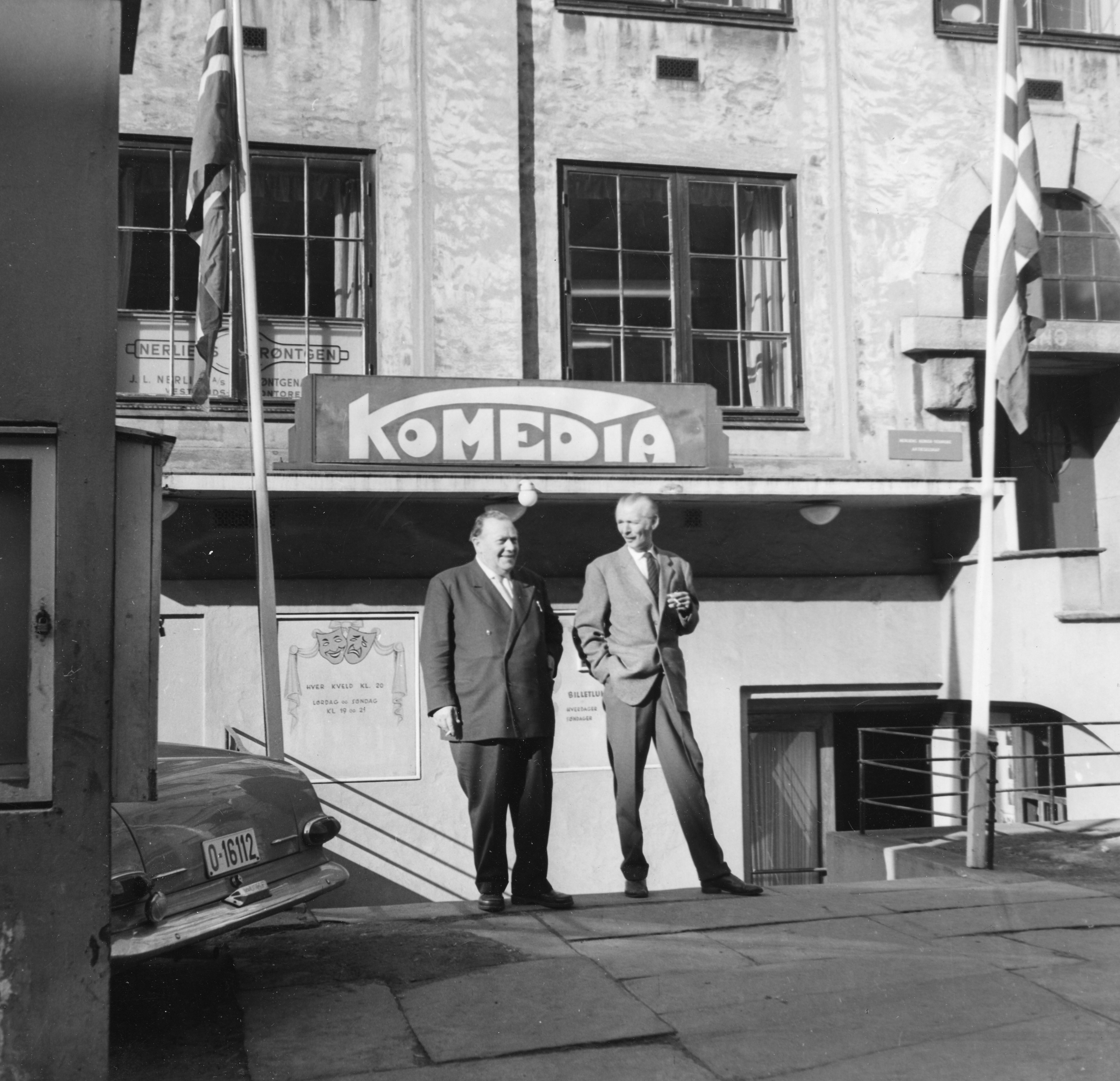 Fotografi av Alv Hordnes og Claus Lavik utenfor Komediateatret.