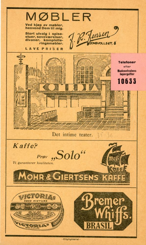 Program fra Komediateatrets produksjon Sara som lo, 1936.
