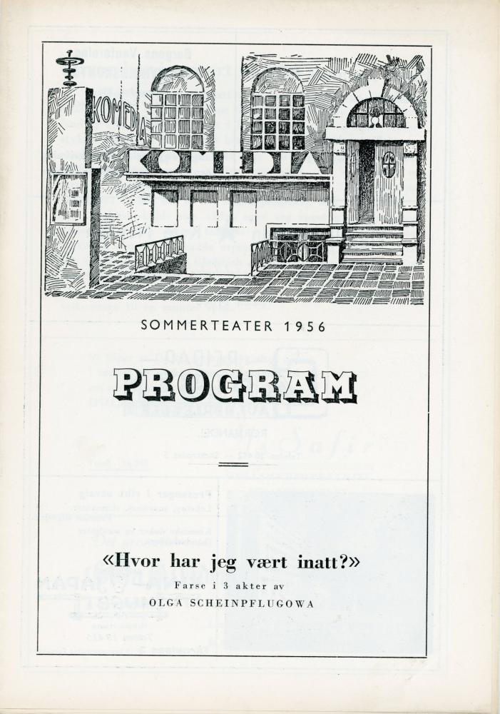 Program fra Komediateatrets produksjon Hvor har jeg vært inatt? 1956.