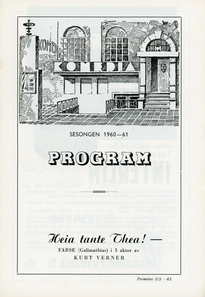 Program fra Komediateatrets produksjon Heia tante Thea! 1961.