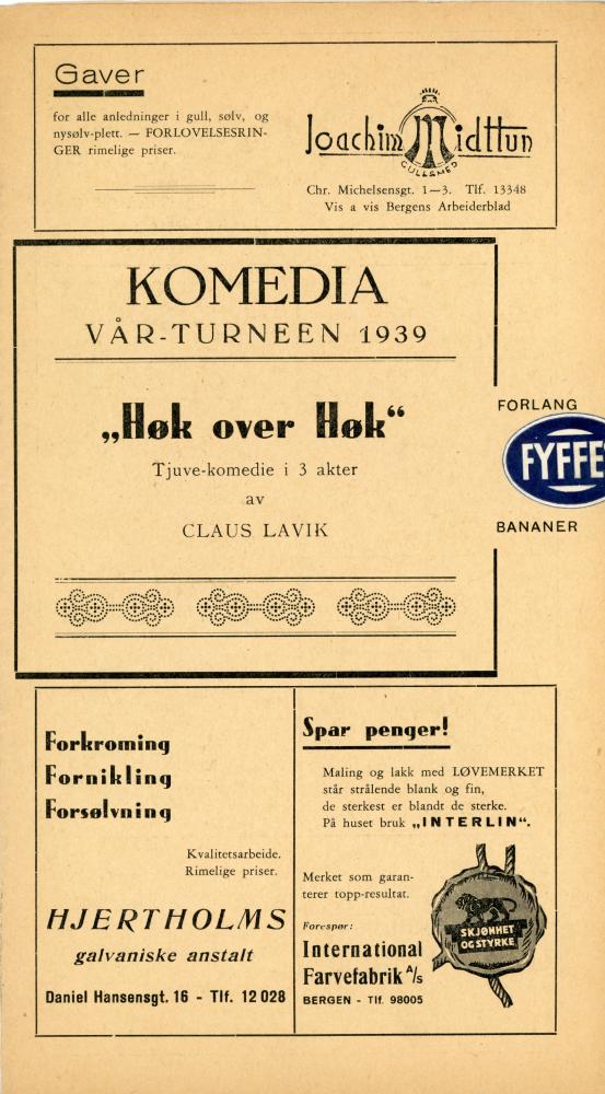Program fra Komediateatrets produksjon Høk over høk, 1939.