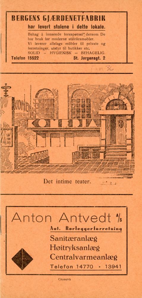 Program fra Komediateatrets produksjon Kjærlighet og melkekrig, 1936