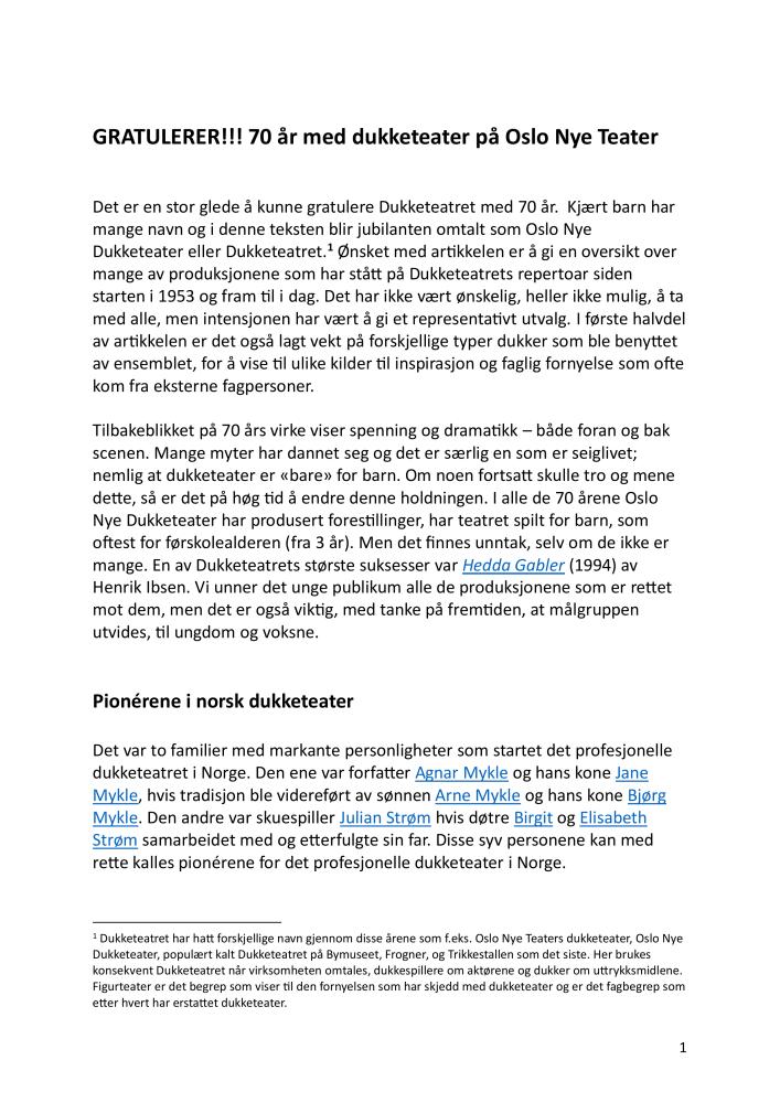 Historisk artikkel om Oslo Nye Dukketeater av Mona Wiig (2024)