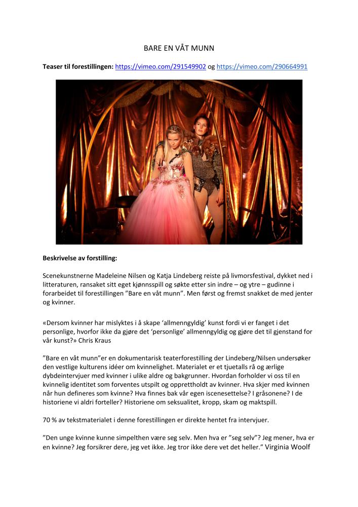 Informasjonsdokument fra Katja Brita Lindeberg Produksjoners produksjon "Bare en våt munn" (2018)