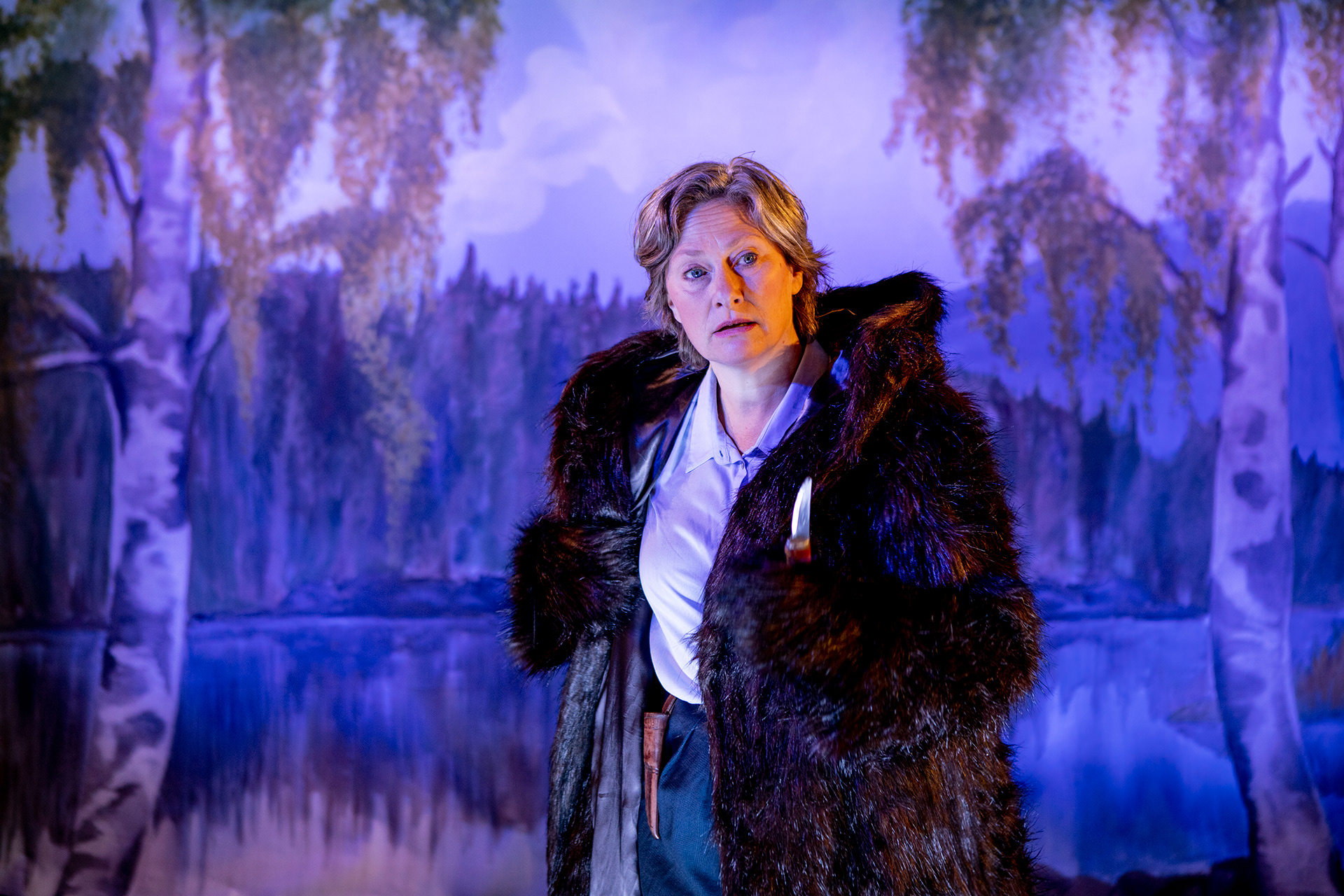 Forestillingsfoto fra Den Nationale Scene og Teater Innlandets produksjon Bjørnejegerskens bekjennelser (2021).