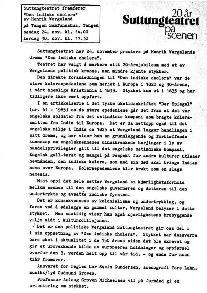 Invitasjon av Suttungteatrets produksjon "Den indiske Cholera" (1985)