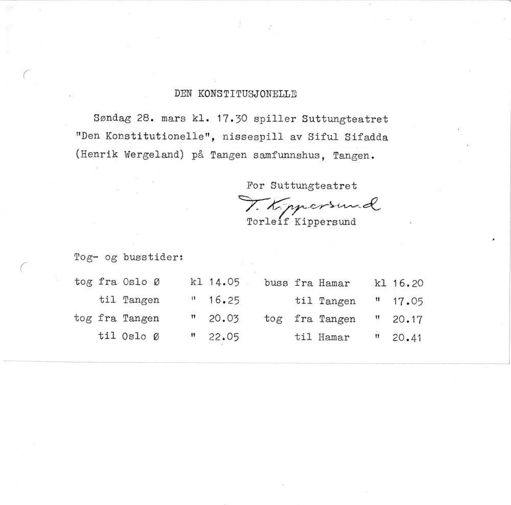 Invitasjon av Suttungteatrets produksjon "Den Konstitusjonelle"