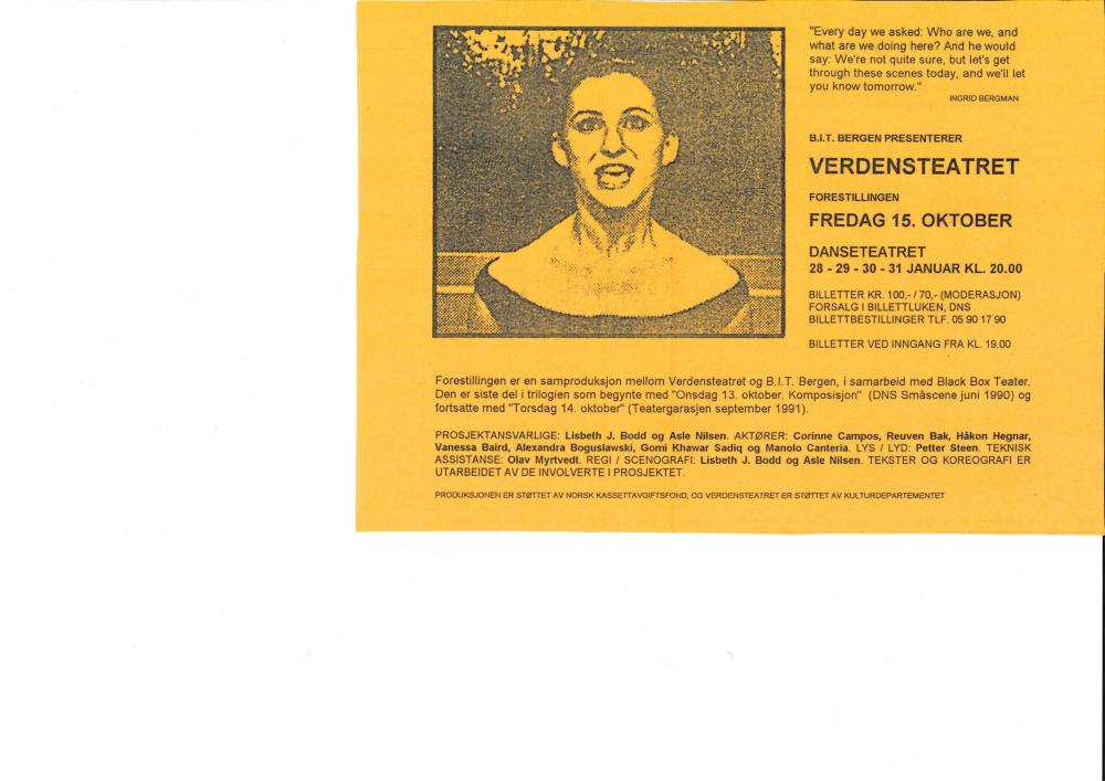Flyer fra Verdensteatrets produksjon "Fredag 15. oktober" (1993)