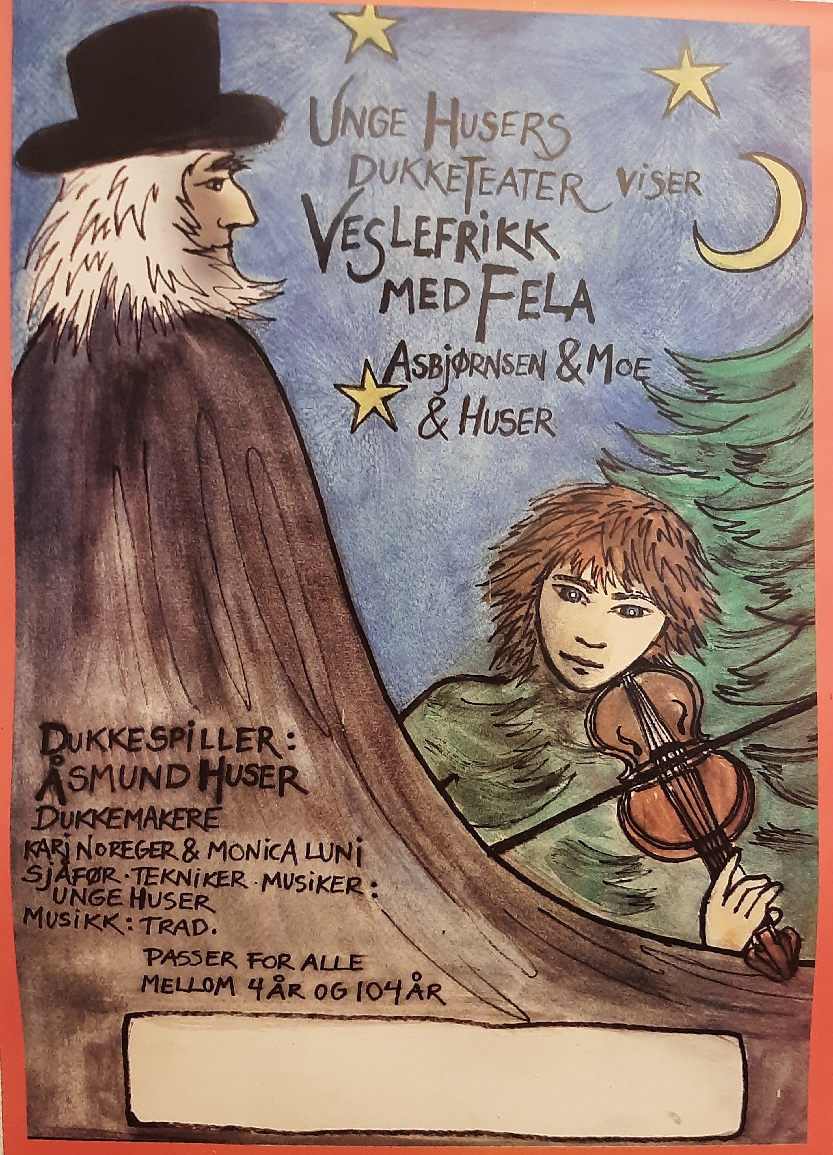 Plakat fra Veslefrikk med fela (premieredato ukjent) av Unge Husers Dukketeater.