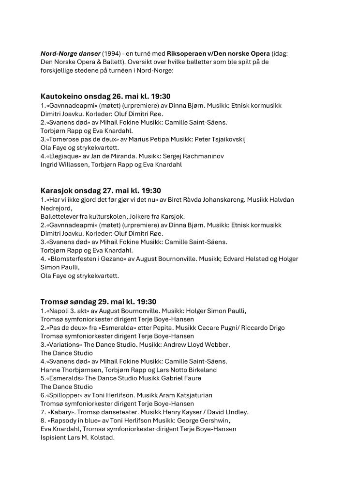 Turnéoversikt for Nord-Norge danser (1994) av Riksoperaen ved Den Norske Opera.