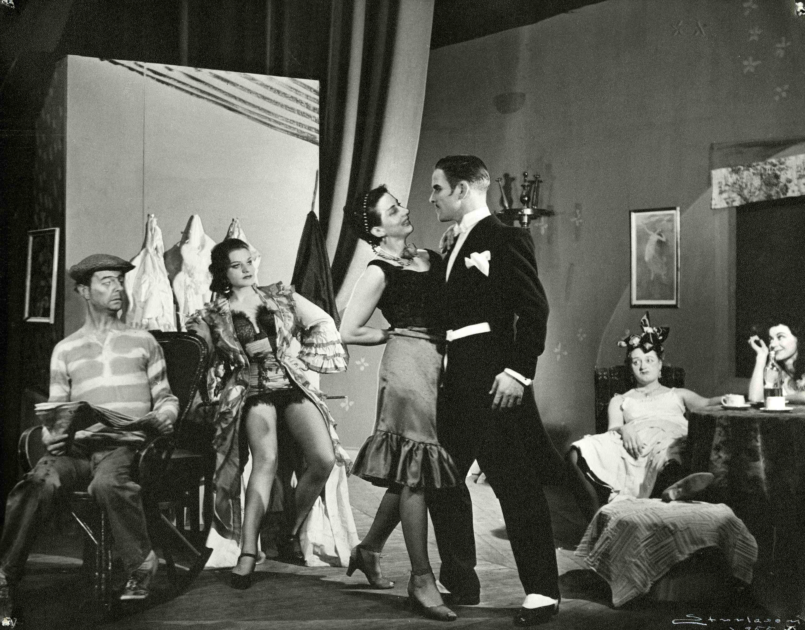 Fotografi fra Folketeatrets produksjon Tolvskillingsoperaen (1955).