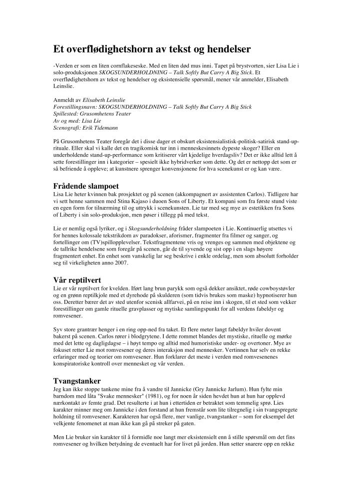 Et overflødighetshorn av tekst og hendelser (Literally: A cornucopia of texts and events). A review of Lisa B. Lie's production Talk Softly But Carry A Big Stick (2007).The review was published byScenekunst.no May 11 2007.