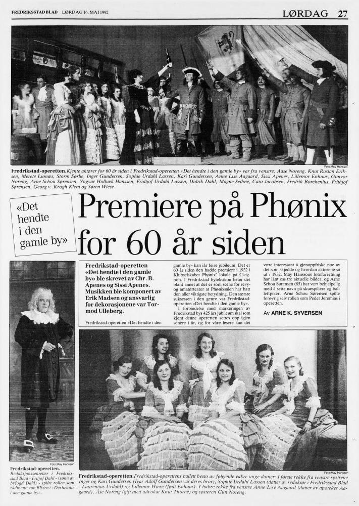 Omtale i Fredrikstad blad (16.5.1992) i anledning 60 år siden urpremieren på operetten Det hændte i den gamle (1932).