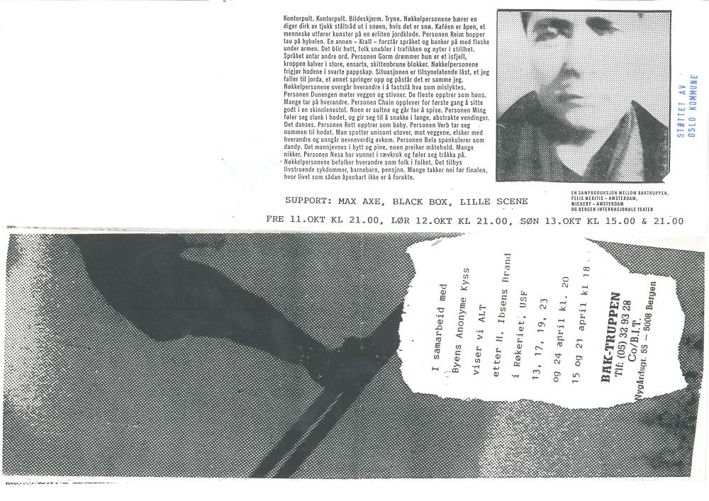 Flier for the production " " by Baktruppen. The photo is a camera obscura image of Erik Balke. The fliers existed with photos of all members in Baktruppen.