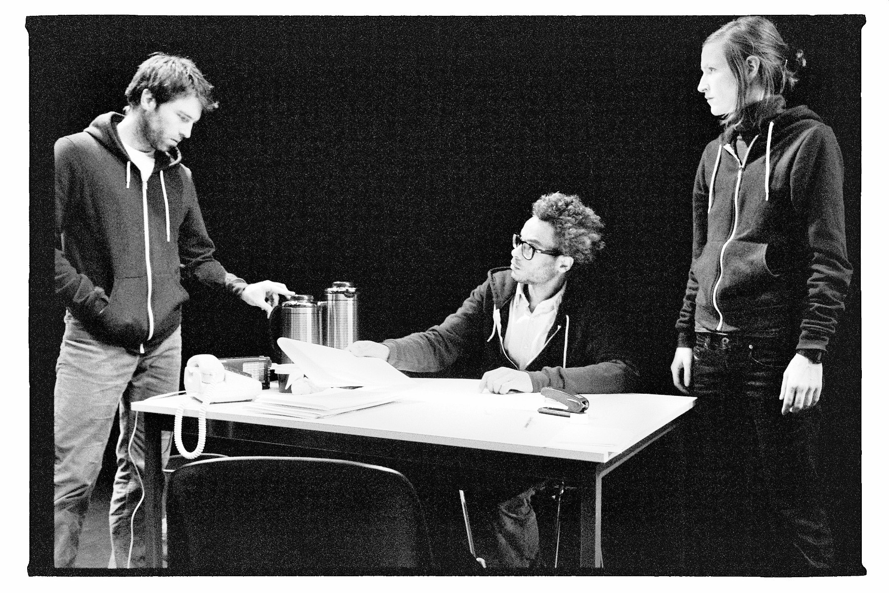 Photography from Mette Edvardsen's production Or else nobody will know (2007). On the picture, from the left: David Helbich, Philippe Beloul and Mette Edvardsen.