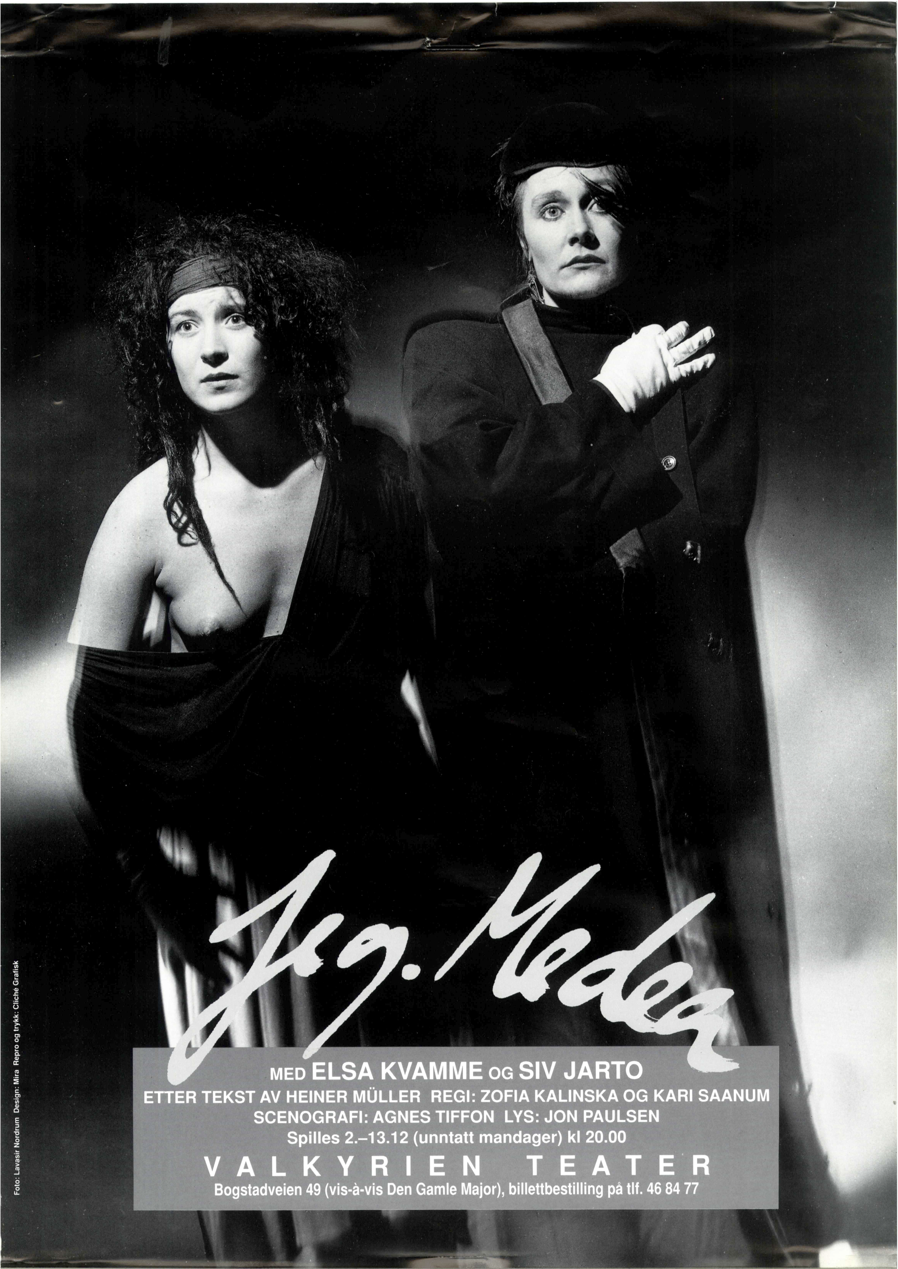 Poster for Valkyrien Teater's production Jeg. Medea* (I. Medea) (1989). In the photo: Siv Jarto and Elsa Kvamme.