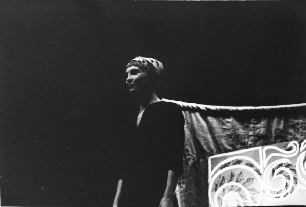 Photo from the Perleporten Teatergruppe production Jug meg en saga* (Lie a saga for me) (1976). In the photo: Karin Benan as Torill. Photographer: Unknown.