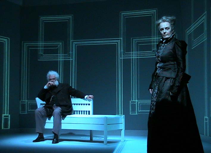 Photo from the production Henrik and Emilie by Niels Fredrik Dahl, produced by The Norwegian Touring Theatre and The National Theatre. From the left: Per Jansen and Marit Østbye. Photo by: Tormod Lindgren.