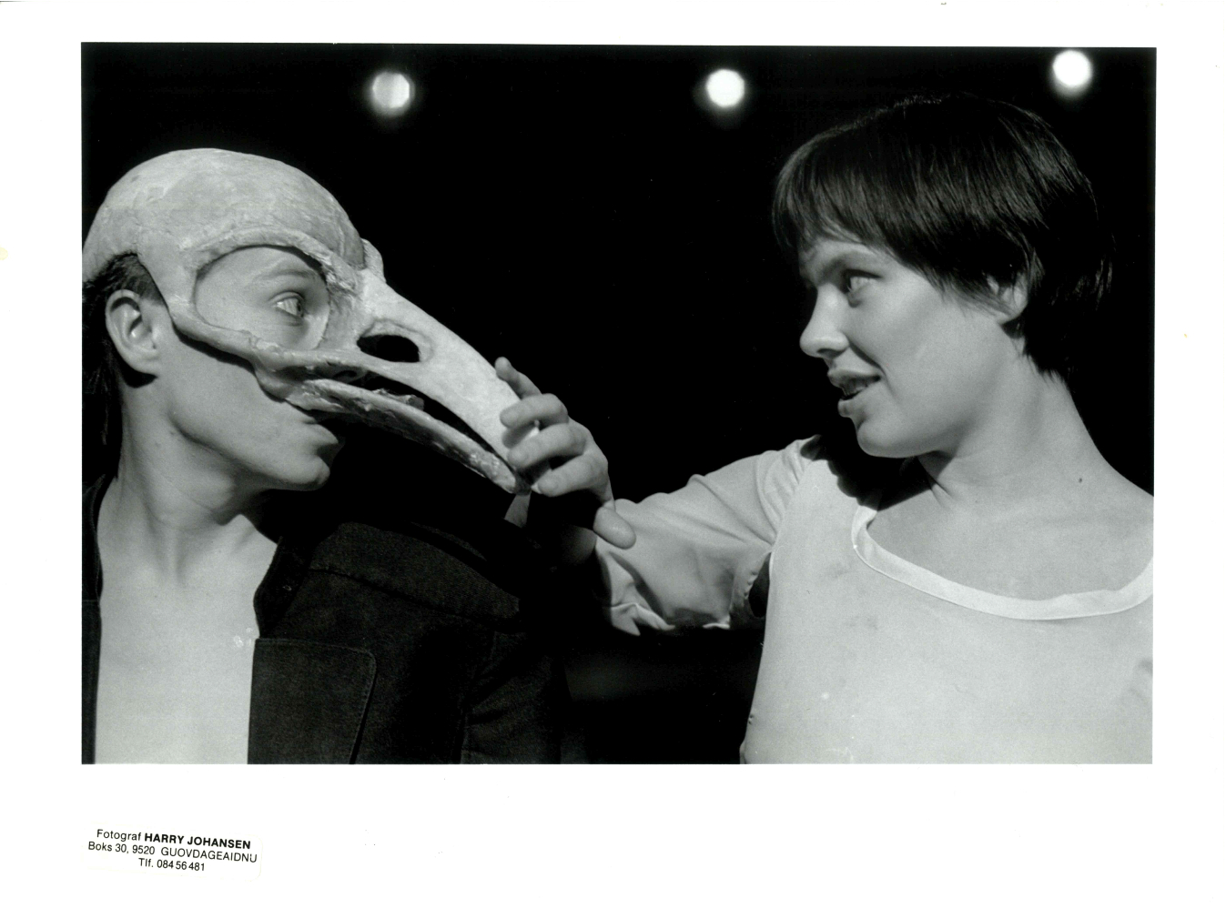 Photo from Sampo Teater and Totalteatret's production Jessica (1993). In the photo: På bildet: Stein Bjørn (as the crow), Inger Kathrine Hansen (as Jessica). Photo by: Harry Johansen.