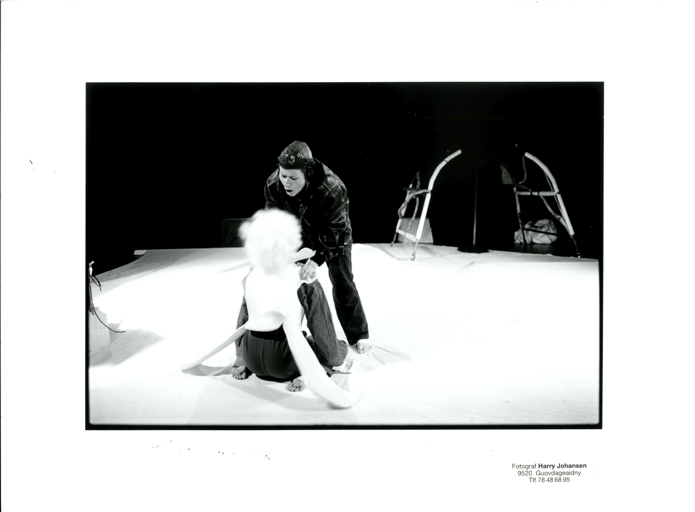 Photo from Sampo Teater and calbmi's production Antoine ja Bás-Prinssas (The Little Prince) (1997). In the photo: Biret Rávdna Johnskareng (as the little prince) and Mary Sarre (as the pilot). Photo by: Harry Johansen.