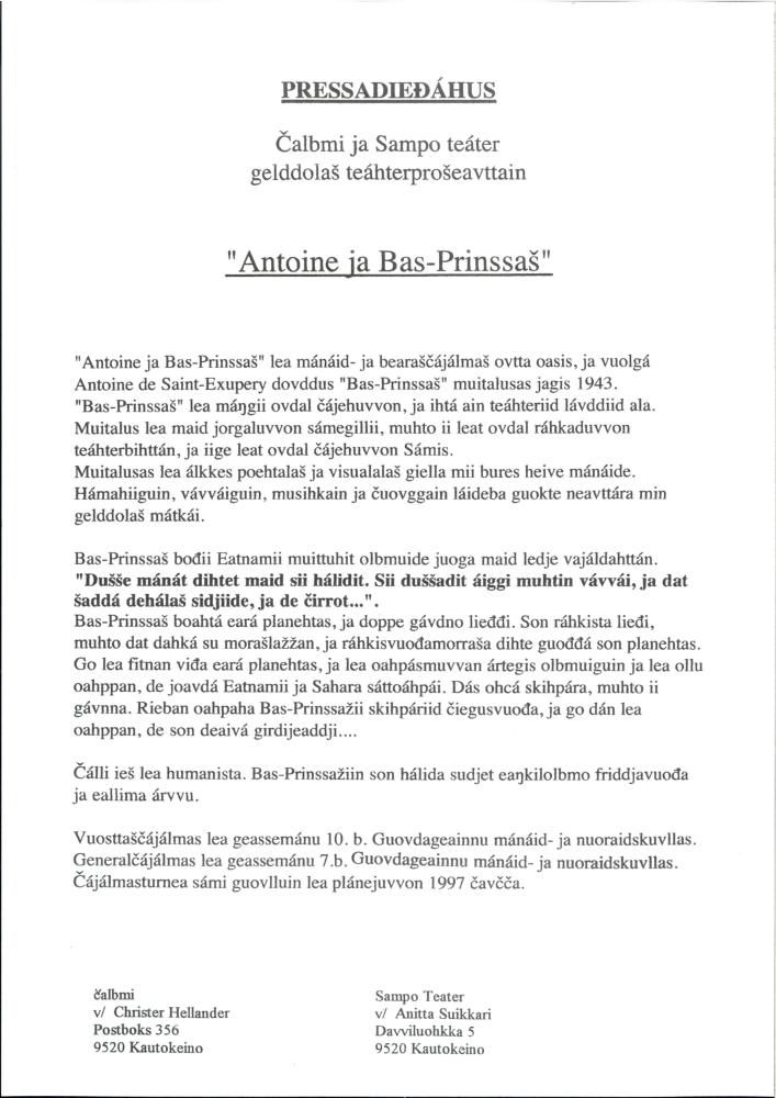 Press release for Sampo Teater and calbmi's production "Antoine ja Bás-Prinssas" (1997).