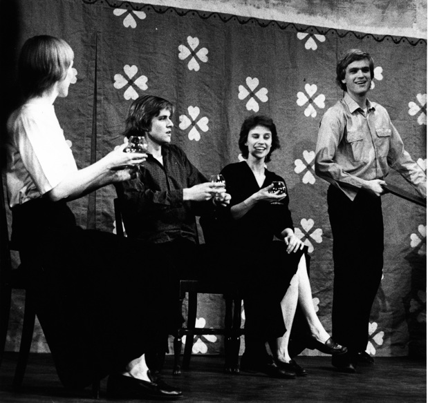 Cheers. Photo from the Perleporten Teatergruppe production Klassebilde* (Yearbook Photo) (1978). In the photo: Karin Benan, Runar Bakken, Birgit Christensen, Karl Hoff. Photographer: Nina R. Lunde.