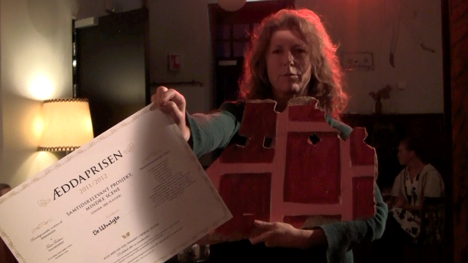 Photo from the Award Ceremony for Æddaprisen (The Ædda Award) 2012, Anne Holtan (dramaturge for De Utvalgte) accepts the award on behalf of De Utvalgte for the production The Art of Being Tamed, in the category of Contemporary Project, smaller venue (less than 300 seats) 2012. Photographer: Marius Kolbenstvedt