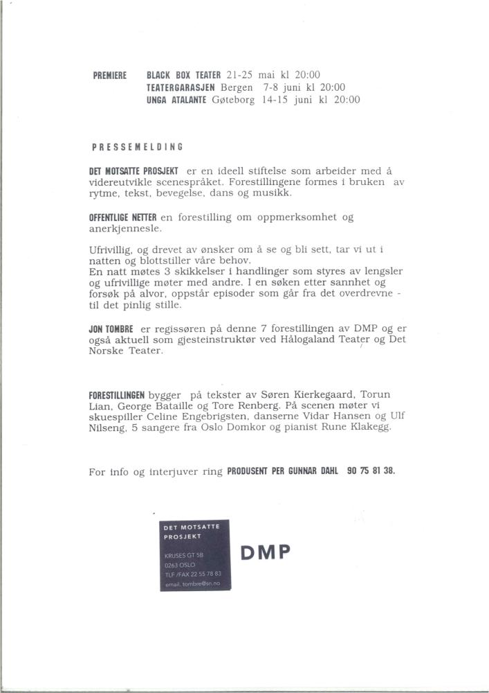Press release for Det Motsatte Prosjekt's production Offentlige netter* (Public Nights), 1997