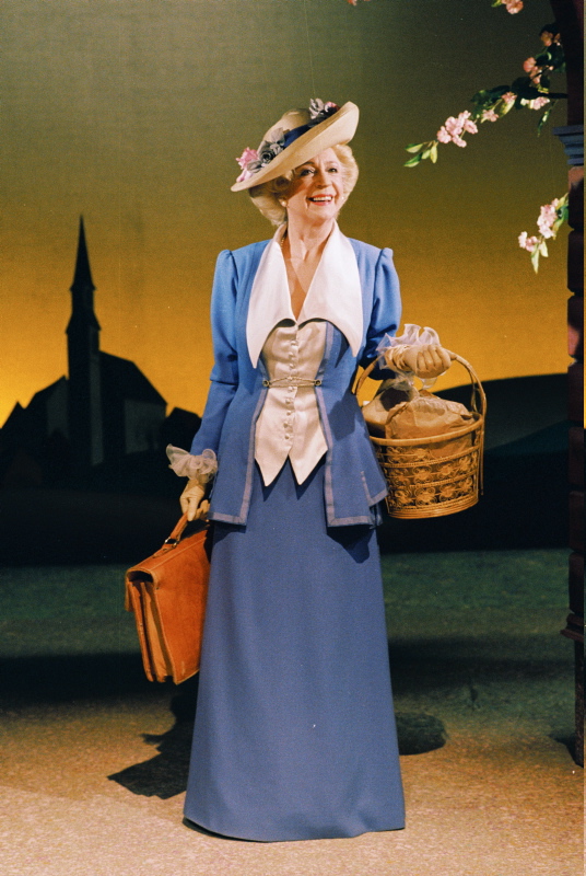 Mrs Arvik stands next to a fruit tree in bloom, carrying a wicker basket in one hand and a leather bag in the other. The production opened November 25 1988. Edith Roger directed and among the performers were Per Sunderland as Arvik, Wenche Foss as Mrs Arvik and Marit Østby as Marna.