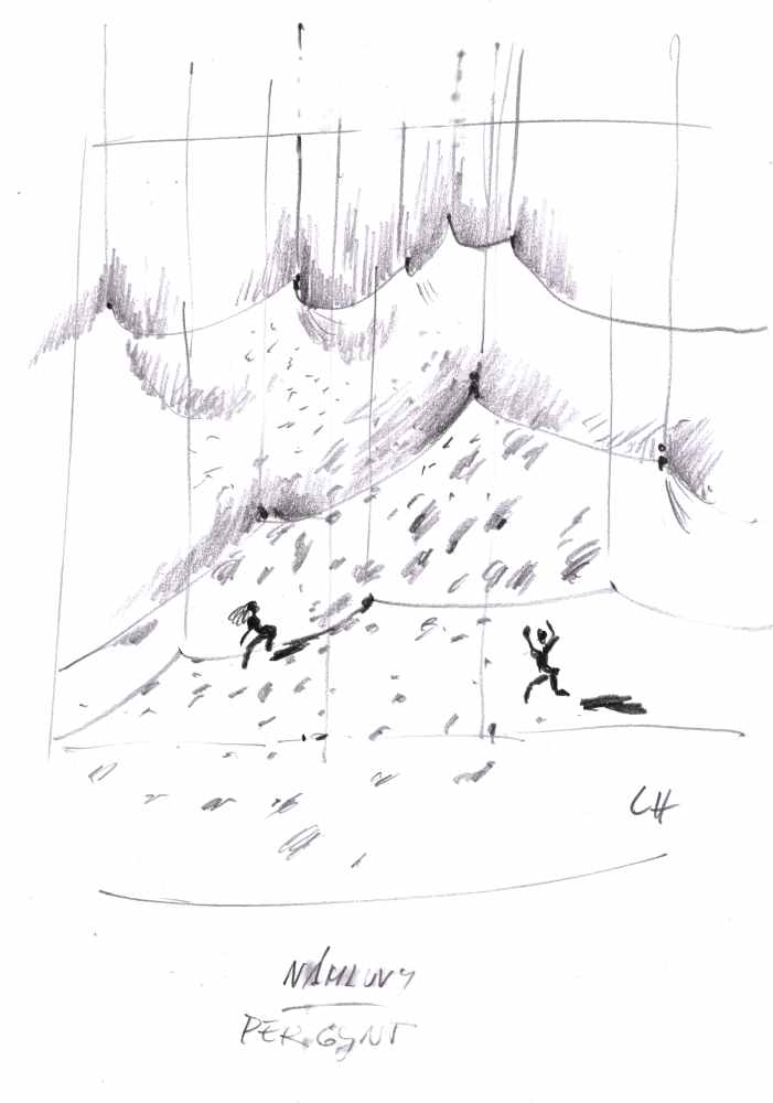 Drawing by Lubos Hruza, of a scene in Peer Gynt, The National Theatre, 1975