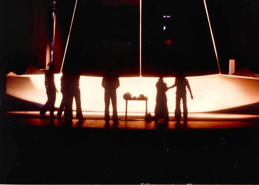 In the photo: Stagehands testing the sails for the stage design of Lubos Hruza.