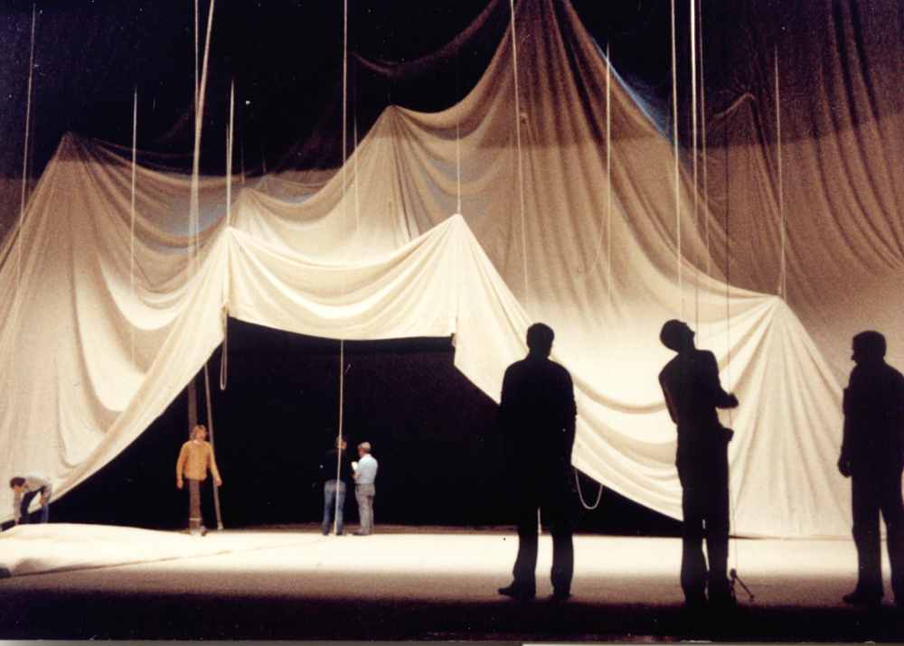 In the photo: Stagehands working with the sails in the stage design of Lubos Hruza.