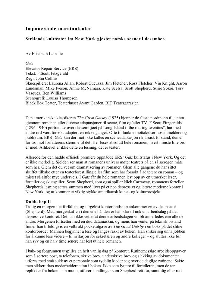 Imponerende maratonteater (literally: Impressive marathon theatre). Review of the New York based theatre company Elevator Repair Service's production Gatz (2006). Gatz visited Black Box Teater, Avant Garden and BIT Teatergarasjen in December 2006. The review was published in Norsk Shakespeare- og teatertidsskrift no. 1/2007.