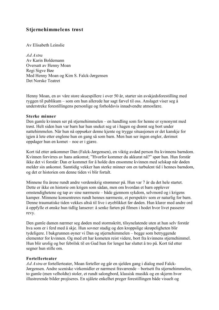 Anmeldelse av Elisabeth Leinslie i Norsk Shakespeare- og Teatertidsskrift av Det Norske Teatrets produksjon "Ad Astra" (2007)