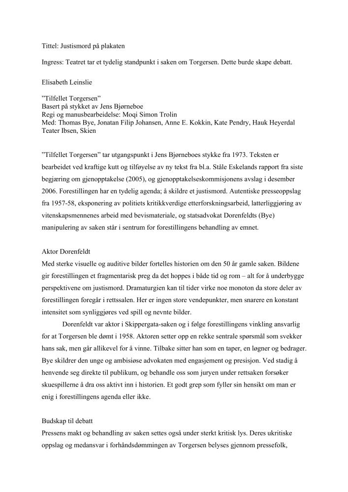 Anmeldelse av Elisabeth Leinslie i Dagsavisen av teater Ibsens produksjon "Tilfellet Torgersen" (2007)