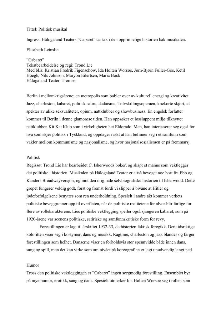 Politisk musikal (literally: Political musical). Review of The Arctic Theatre's production Cabaret (2007). The review was published in Dagsavisen January 13 2007.