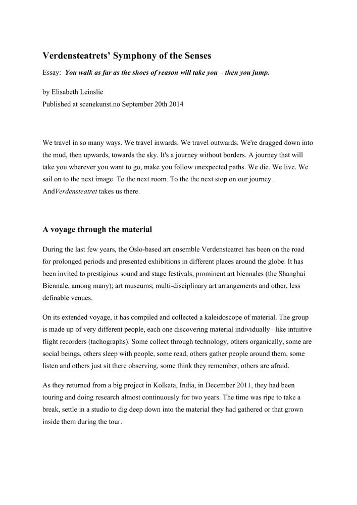 Verdensteatrets´Symphony og the Senses. Essay about Verdensteatret and their production Bridge over Mud (2014). The text was written on assignment from Verdensteatret. This version is in English, the original Norwegian version you fin here.