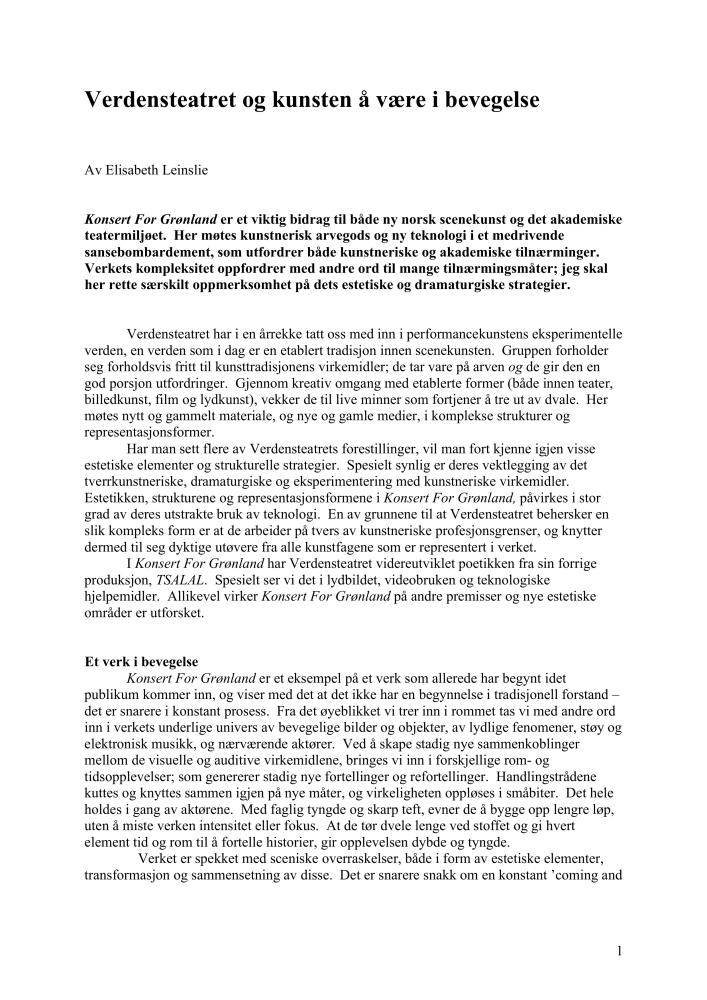 Artikkel av Elisabeth Leinslie om Verdensteatrets produksjon "Konsert for Grønland" (2004)