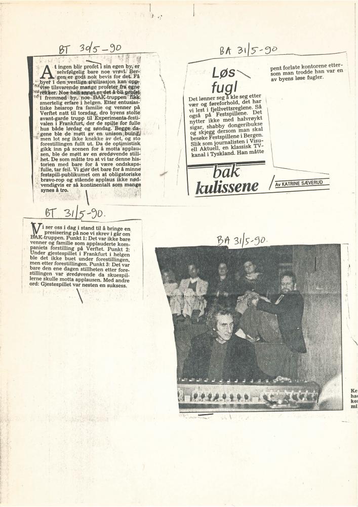 Notis, 30.05.90, i Bergens tidende om Baktruppen i forbindelse med Baktruppens produksjoner "Germania Tod in Berlin" (1989)