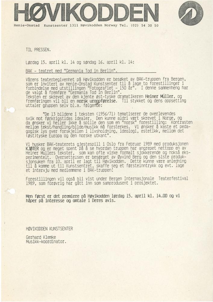 Pressemelding fra Henie-Onstad Kunstsenter om Baktruppens produksjon "Germania Tod in Berlin" (1989)