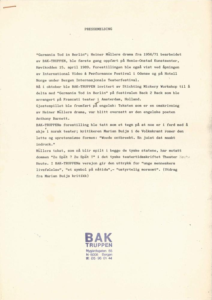 Pressemelding fra Baktruppen om Baktruppens produksjon "Germania Tod in Berlin" (1989)