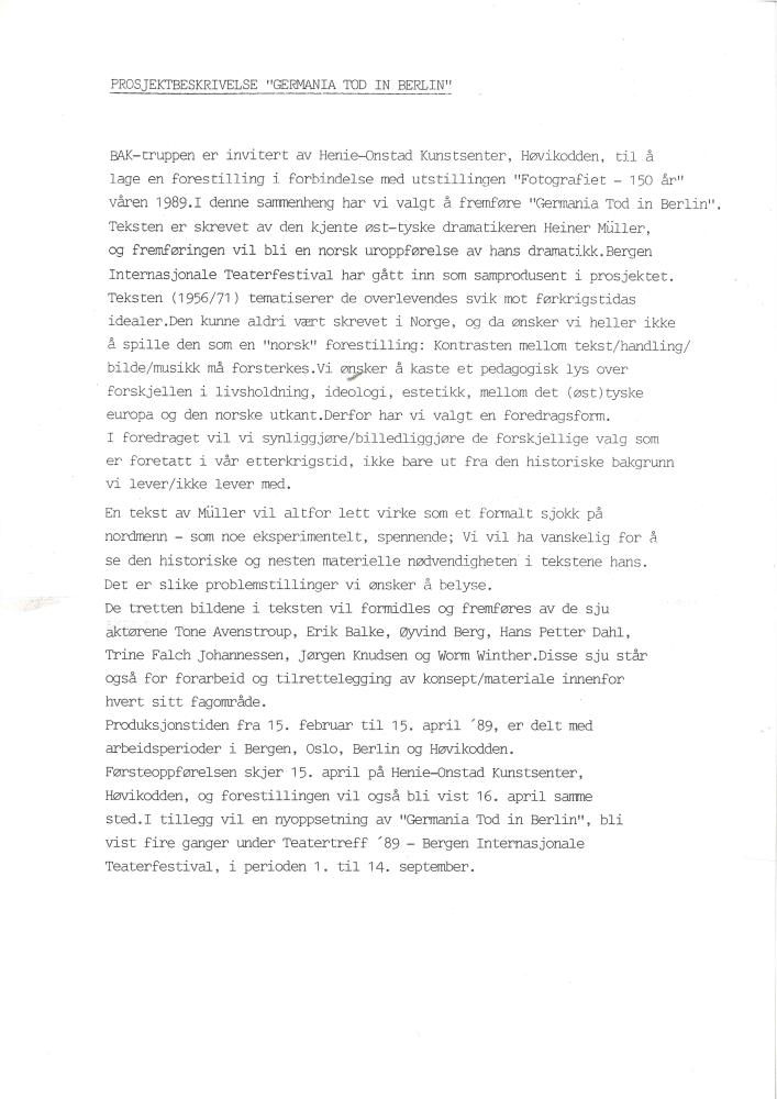 Prosjektbeskrivelse av Baktruppens produksjon "Germania Tod in Berlin" (1989)
