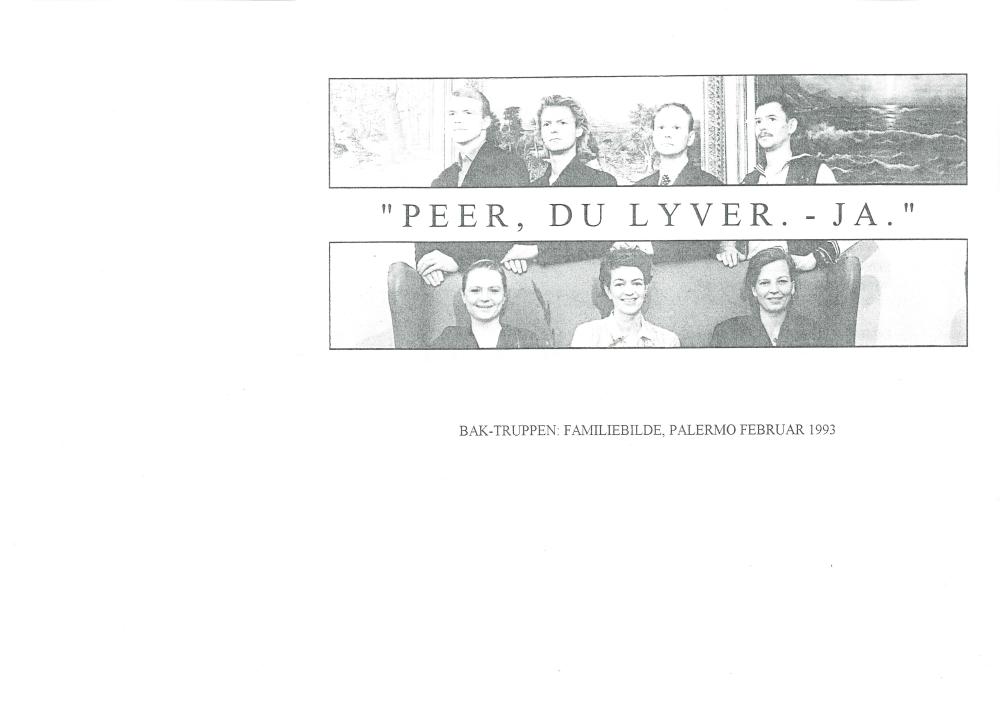 Flyer til Baktruppens produksjon "Peer, du lügst. Ja!/Peer, du lyver. Ja!/Peer, you're lying. Yes!" (1993) / Teatergarasjen 6.- 9.mai 1993